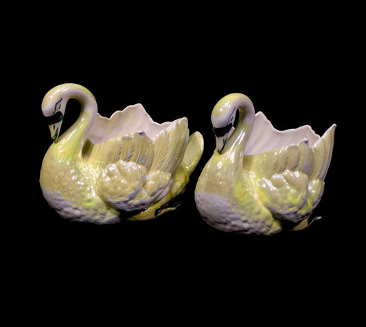 Vintage Pair of Glazed Swans Ceramic Planters Indoor Plant Pots Statues Antique