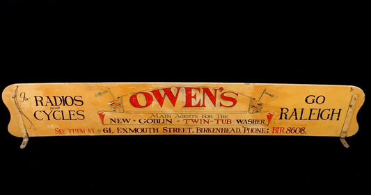 Antique Advertising Large Owens Birkenhead Shop Wooden Display Sign Radio Cycle