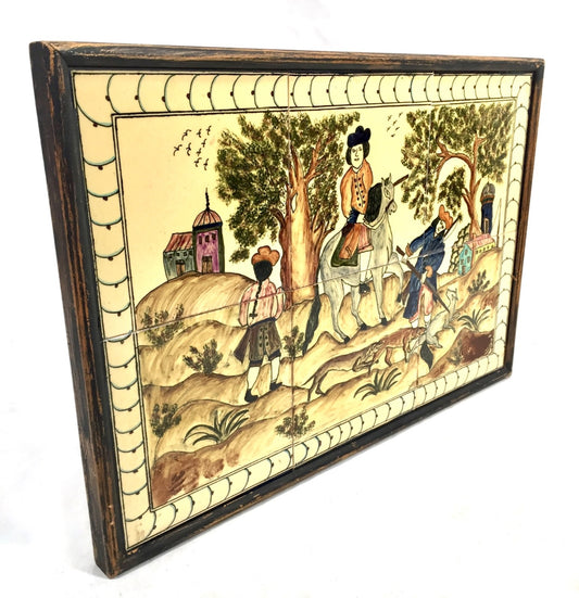 Vintage Hand Painted Framed Hunting Art Scene Ceramic Tiles in Wooden Frame