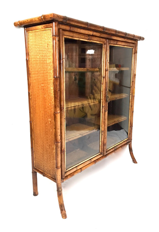 Antique 1920s Glazed Door & Bamboo Rattan Bookcase / Display Cabinet / Shelf