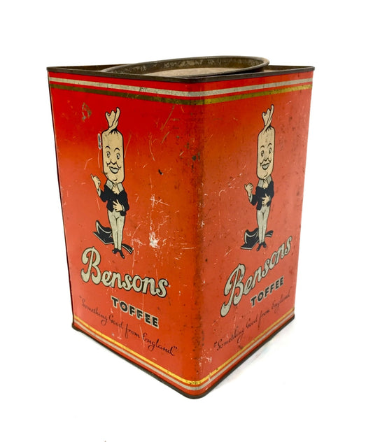 Antique Advertising English 1950s Pictorial Bensons Toffee Tin Container & Lid