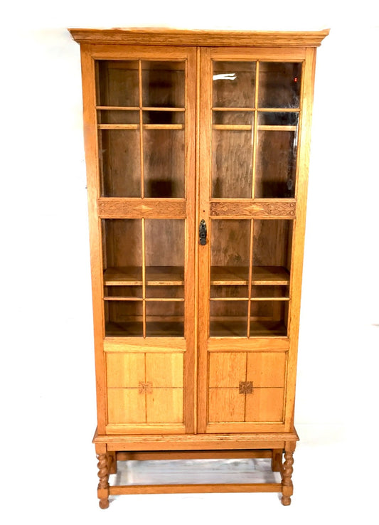 Antique 1930s Wooden Oak Display Bookcase Cabinet with Glazed Doors Barley Twist