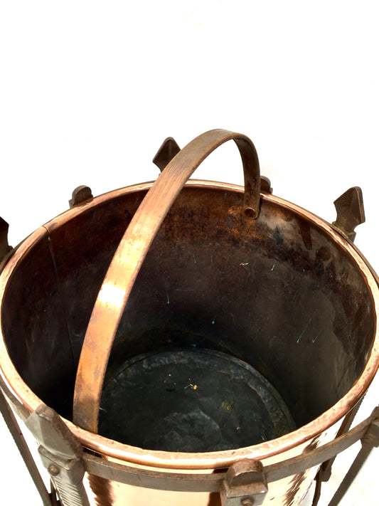 Arts and Crafts Copper Coal Bucket | Circular Form with Wrought Iron Stand & Lid