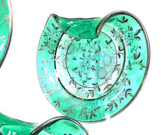 Vintage Green Art Glass With Floral Silver Overlay Serving Dish Plate Set Retro